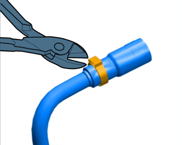 4 Демонтировать зажимной хомут с одной проушиной между коротким резиновым шлангом и жестким трубопроводом. Затем снять короткий резиновый шланг.