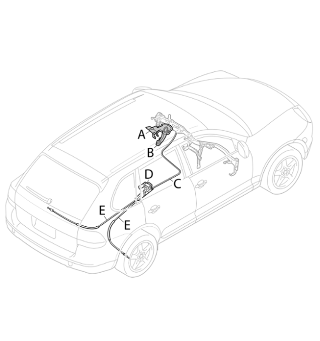 Тормозной трос, задний-E- т.е.: От перенаправляющего элемента под центральной консолью -D- до фиксатора в тормозном барабане дискового тормоза заднего колеса.