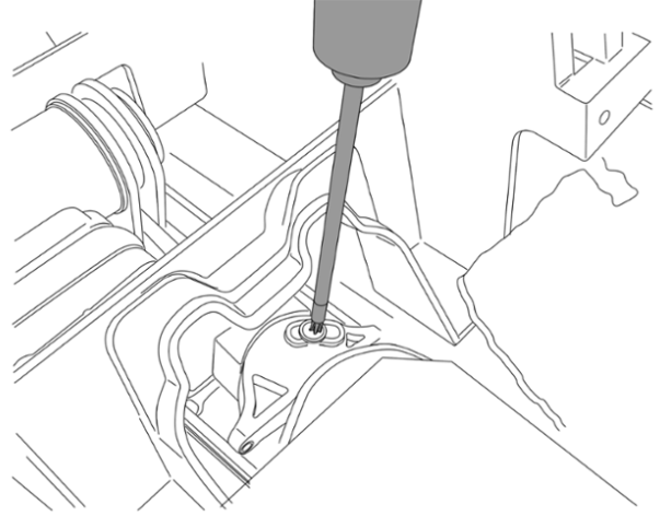 15 Трос слегка протолкнуть в тормозной барабан. С помощью маленькой отвертки -см. рис.- через отверстие в тормозном диске отжать вверх стопорную пружину и шестигранник на распорном рычаге и одновременно вытянуть тормозной трос из барабана.