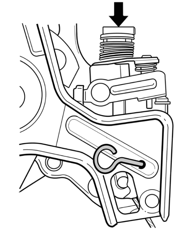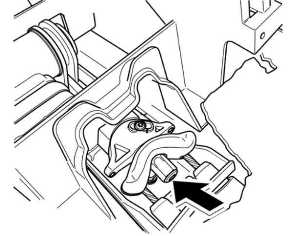 9 Шаровую головку извлечь из коромысла перенаправляющего элемента в направлении стрелки -см. рис.- и отвести в сторону. Оболочку троса в салоне (2 пластиковых колпачка) слегка сжать и просунуть назад, против направления движения.
