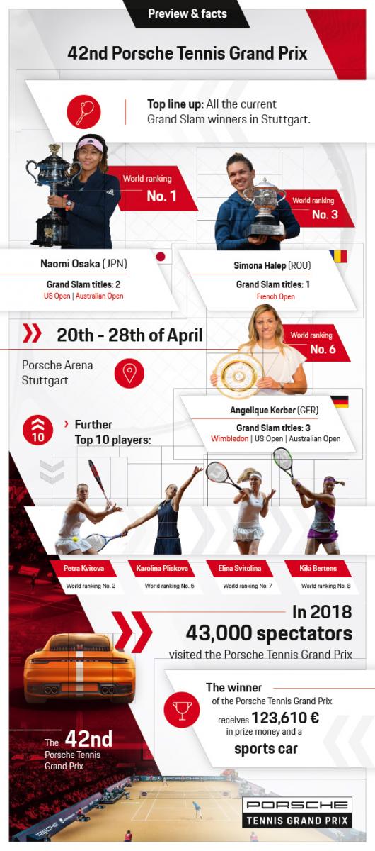 Штутгарт. Новая звезда женского тенниса подала заявку на участие в Porsche Tennis Grand Prix: Наоми Осака, поднявшаяся на вершину мирового рейтинга после победы на Australian Open, примет участие в традиционном теннисном турнире с 20 по 28 апреля на Порше-Арена. 21-летнюю японку, уже одержавшую победу на US Open в сентябре 2018 года, ждет хорошая компания. Впервые с 2012 года в Штутгарте выступят все действующие победительницы Большого шлема: кроме Наоми Осака в турнире примут участие Симона Халеп (Румыния), победительница French Open и номер 3 в мировом рейтинге, а также победительница Уимблдона и официальная представительница марки Porsche Анжелика Кербер (номер 6). Всего на 42-й розыгрыш Porsche Tennis Grand Prix приедут семь теннисисток, входящих в десятку лучших ракеток мира.